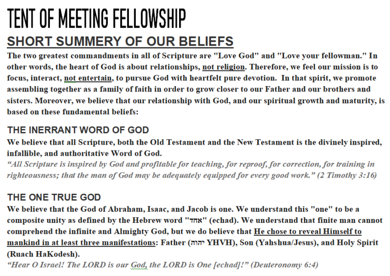 Tent Of Meeting Fellowship, we affirm and the belief that "The church is the not the steeple, but the people" Yahshua did not come to start a religion, but to live inside believers who have given themselves to intimate fellowship with Him! Our Tent Of Meeting Fellowship mission is all about revival, which is given based upon the "Acts Blueprint" found in the book of Acts, where we see the church thriving and succeeding through the guidance and power of the Holy Spirit, bringing people to truly know Him!!!